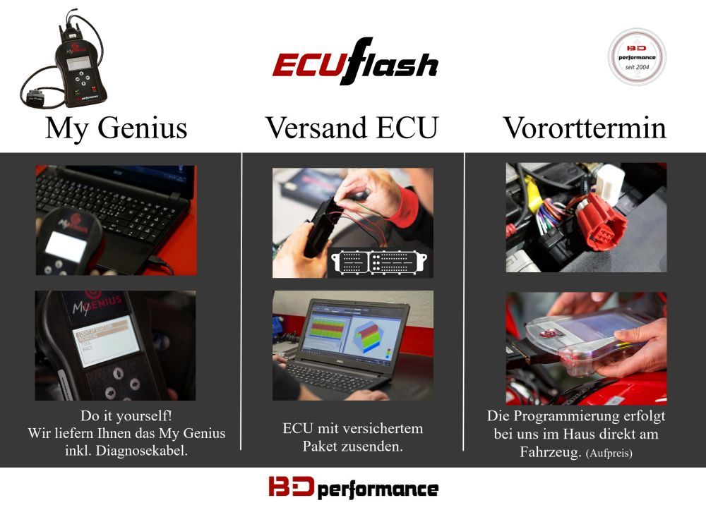 My Genius (Kundenflasher): hier erwerben Sie das My Genius sowie ein passendes Diagnosekabel und 1 optimiertes Kennfeld für Ihr Fahrzeug. Der Vorteil: die ECU muss nicht ausgebaut und verschickt werden. Sie erhalten von uns das My Genius inkl. Kabel (Versand mit DHL). Sie installieren die Software auf Ihrem Computer und lesen die original Datei/Identifikationsnummer mittels dem My Genius und dem Diagnosestecker am Fahrzeug aus. Diese Daten senden Sie uns per E-Mail zu. Wir erstellen Ihr individuelles Kennfeld und lassen Ihnen dieses ebenfalls per E-Mail zukommen. Im Anschluss können Sie Ihr optimiertes Kennfeld auf Ihre ECU schreiben. Sie können jederzeit von Serie auf Tuning wechseln so oft Sie möchten. Das My Genius ist für Ihr nächstes Fahrzeug wieder verwendbar (sofern dieses unterstützt wird, hierfür muss das My Genius zu uns geschickt werden, damit wir dieses dem neuen Fahrzeug zuordnen können (gegen Gebühr). Es können bis zu 10 Kennfelder inkl. der Originaldatei auf dem My Genius gespeichert werden.